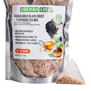 Unser Chaga-Tee mit Eleuthero-Wurzel wird vollständig und nachhaltig aus Sibirien bezogen und besteht aus einer 50/50-Mischung aus Chaga-Pilz und Eleuthero-Wurzel, was ihn sehr nahrhaft und benutzerfreundlich macht, da er in Teebeuteln verpackt ist.