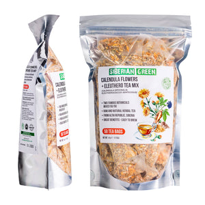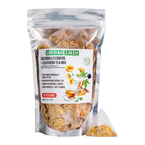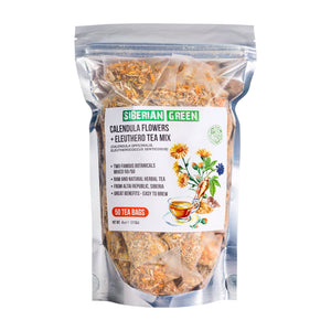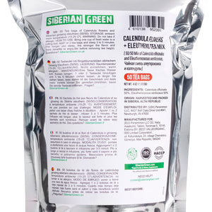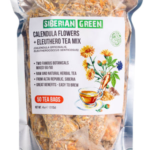 Nutzen Sie die Vorteile der Natur mit Siberian Green Eleuthero Root & Calendula Flower Tea, einer hochwertigen Mischung aus wild geernteten Kräutern, die direkt aus dem sibirischen Altai-Gebirge stammen. Das Endprodukt ist ein fachmännisch hergestellter und ausgewogener Kräutertee. Dieser Tee besteht zur Hälfte aus der kraftvollen Eleuthero-Wurzel (sibirischer Ginseng) und zur anderen Hälfte aus beruhigenden Ringelblumenblüten. Er ist ein Kräutertee, der entspannend wirkt, die Energie steigert, das Immunsystem unterstützt und viele weitere Vorteile bietet, ohne dabei Koffein zu enthalten.